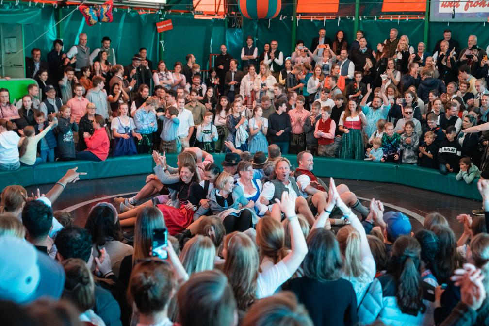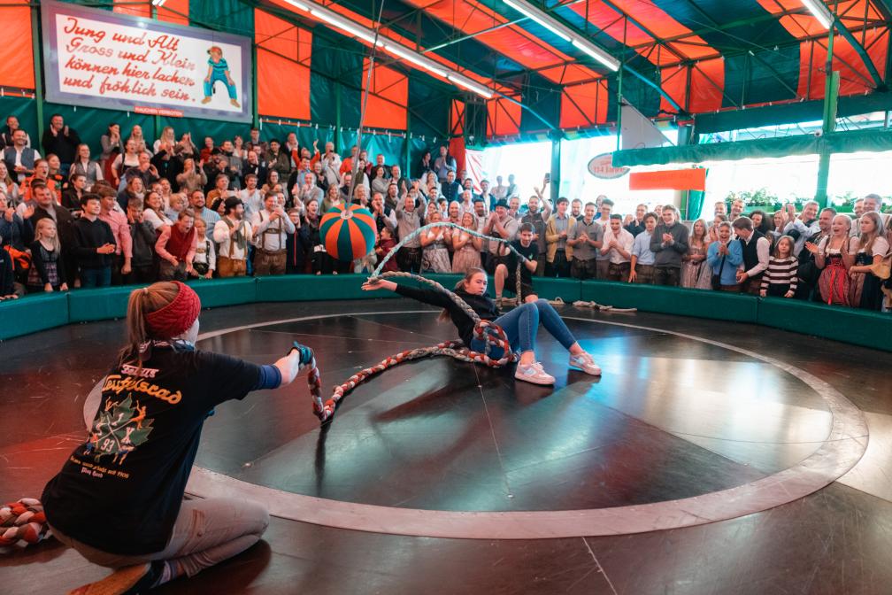 Wer das Teufelsrad zum ersten Mal besucht, wundert sich: Hier gibt’s keine moderne Technik und auch kein „schneller, höher, wilder”, sondern ein ebenso simples wie geniales Konzept. In der Mitte der hölzernen Arena befindet sich eine große Scheibe, die sich dreht. Auf das Kommando des Moderators, zum Beispiel „Es fahren alle Kinder zwischen 8 und 14 Jahren!” oder „Alle Mädchen ab 18 im Dirndl!”, stürmen besagte Auserwählte die Scheibe und setzen sich. Die besten Plätze befinden sich in der Mitte. Dann setzt sich die Scheibe in Bewegung - erst langsam, dann immer schneller, begleitet von den teils ziemlich derben, aber immer auf bayerische Art charmanten Sprüchen und Zoten der Moderatoren. Ein Fahrgast nach dem anderen rutscht durch die Fliehkraft von der Scheibe, und wer nicht von selbst aussteigt, wird mit einem gekonnten Lassowurf oder einen großen Ball, der an einem Seil hängt, „abgeschossen”.