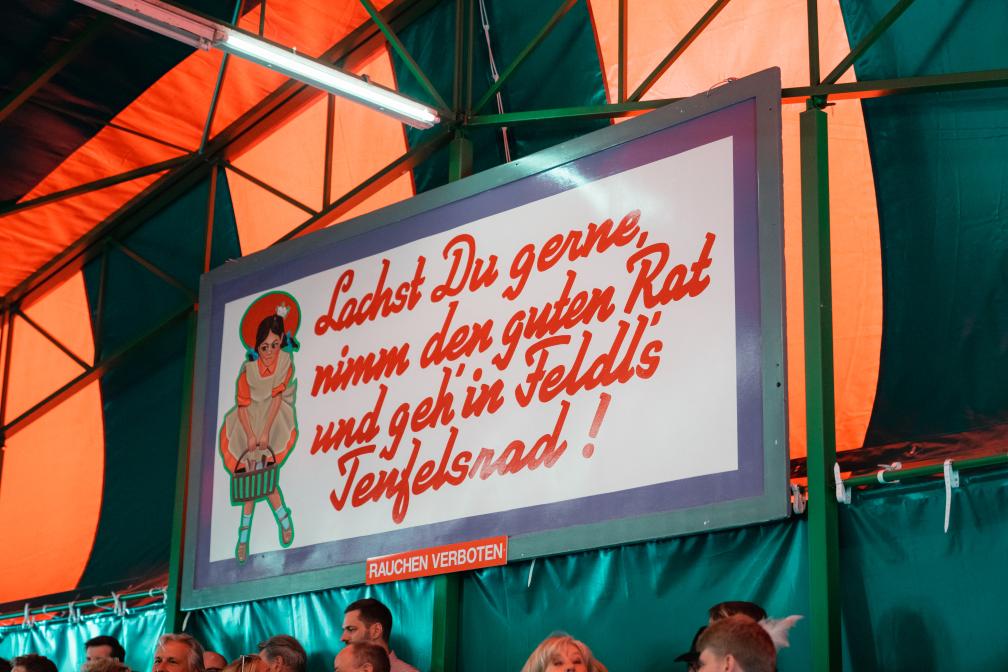 Dass das Teufelsrad eine lustige, ja komische Angelegenheit ist, ist amtlich: Schon Karl Valentin und Liesl Karlstadt sind hier mitgefahren. Seit 1908 gibt’s die Drehscheibe mit den schönsten Beleidigungen auf dem Oktoberfest.