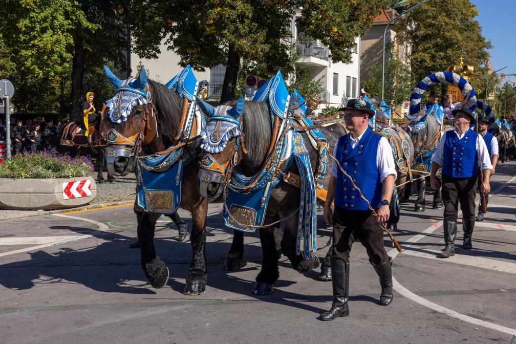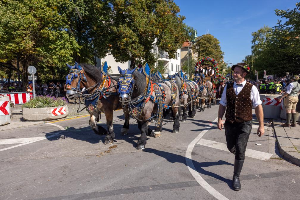 Vorne reitet wie immer das Münchner Kindl, wenig später folgt die erste Festkutsche mit OB Dieter Reiter und seiner Frau, die traditionell von der Stadtwache Würmesia begleitet wird. Wie schon beim Einzug der Brauereien und Festwirte teilen sich die Bürgermeister Dominik Krause und Bürgermeisterin Verena Dietl eine Kutsche, auch der Bayerische Ministerpräsident Dr. Markus Söder ist regelmäßig mit seiner Frau dabei, ebenso wie Wiesnchef Dr. Christian Scharpf und Wiesn-Stadträtin Anja Berger.